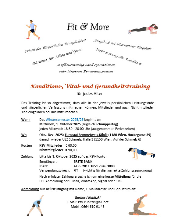 Als Sektionsleiter von „FIT&MORE“ und „Schwimmen“ stelle ich diese KSV-Angebote vor und lade alle Altersgruppen zum Mitmachen ein: